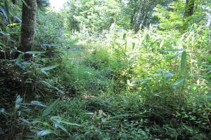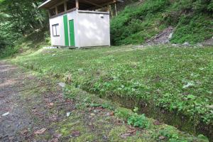 ひと月たち 草でおおわれたプレハブ周辺