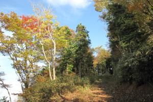 頂上付近の赤く色づく紅葉
